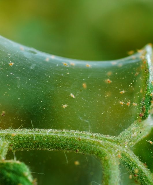Spinnmilbe – Tetranychus telarius – Spinnmilben befinden sich oft auf der Unterseite von Pflanzenblättern. Diese winzigen saugenden Schädlinge verursachen erhebliche Schäden in Gewächshäusern, Folientunneln, Wintergärten sowie in Freilandgärten.